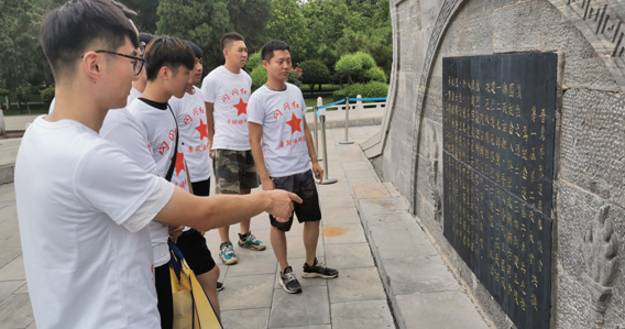 8月5日,团队队员来到了邯郸市的晋冀鲁豫烈士陵园。入门处,巍然耸立着高24米的烈士纪念塔,塔顶光芒四射的红五星,象征着中国革命的伟大胜利。塔的正面镌刻着毛泽东的题词:“英勇牺牲的烈士们千古无上光荣”,东、北、西三面分别为周恩来、刘少奇,朱德的题词。