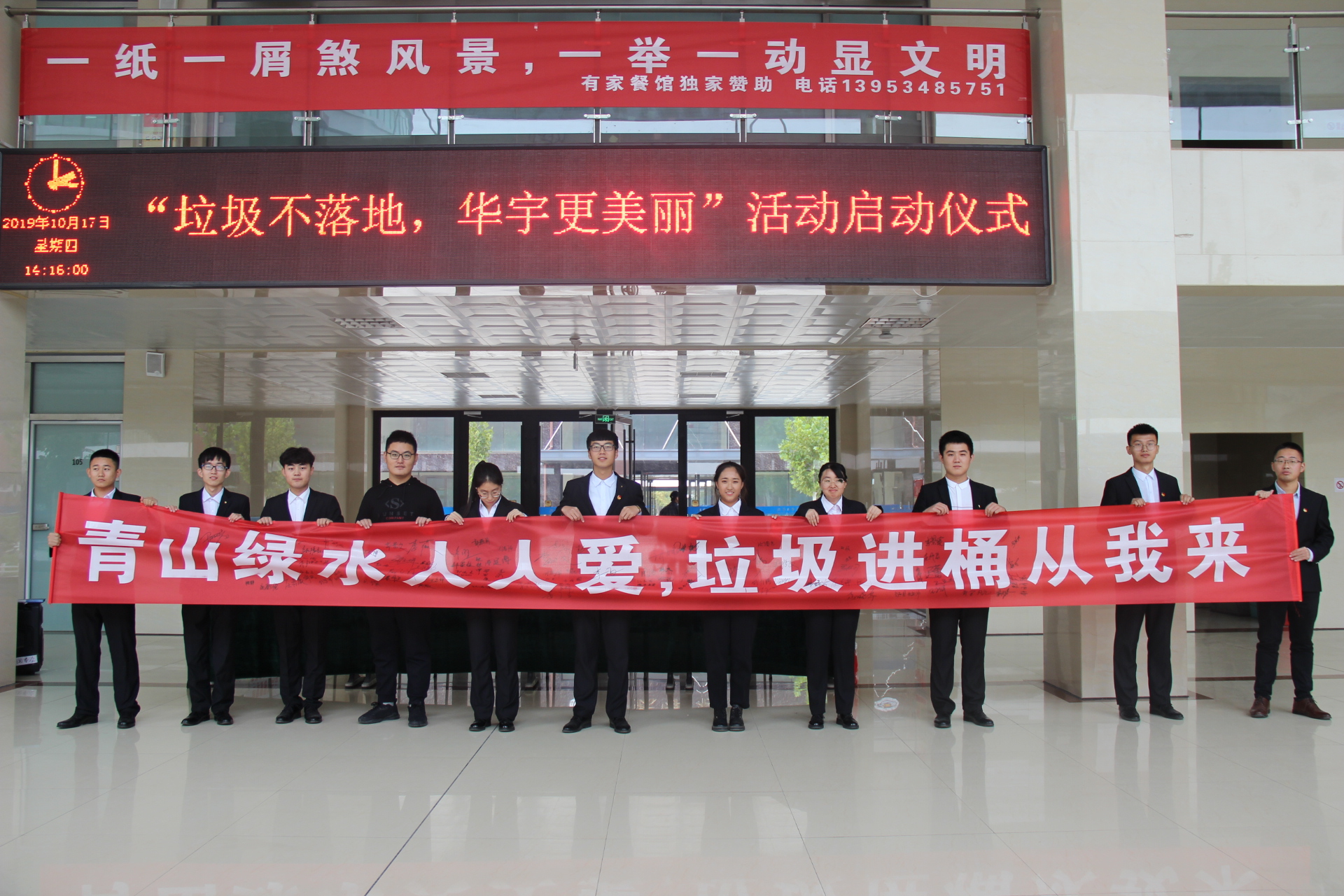 本次启动仪式拉开了公司“垃圾不落地,华宇更美丽”主题活动的序幕。在启动仪式上员工代表赵化斌上台宣读倡议书,希望同学们能够从身边做起,从小事做起,以主人翁的姿态投入到环保工作中,为创建绿色校园贡献自己的一份力量。随后李玉凤经理发表倡议讲话,作为新时代的老员工,要学会自律、自我管理,锤炼优秀品质,希望同学们在学习生活中树立环保意识,为建设美丽校园做出自己的贡献。最后全体领导和员工代表在横幅上签字。