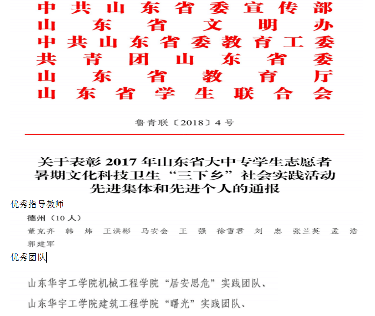 为表彰先进,推动“三下乡”社会实践活动持续深入开展,探索完善长效机制,提升育人效果。省委宣传部、省文明办、省委高校工委、团省委、省教育厅、省学联决定,对在2017年“三下乡”社会实践活动中表现突出的优秀组织单位、优秀指导教师和优秀员工给予表彰。