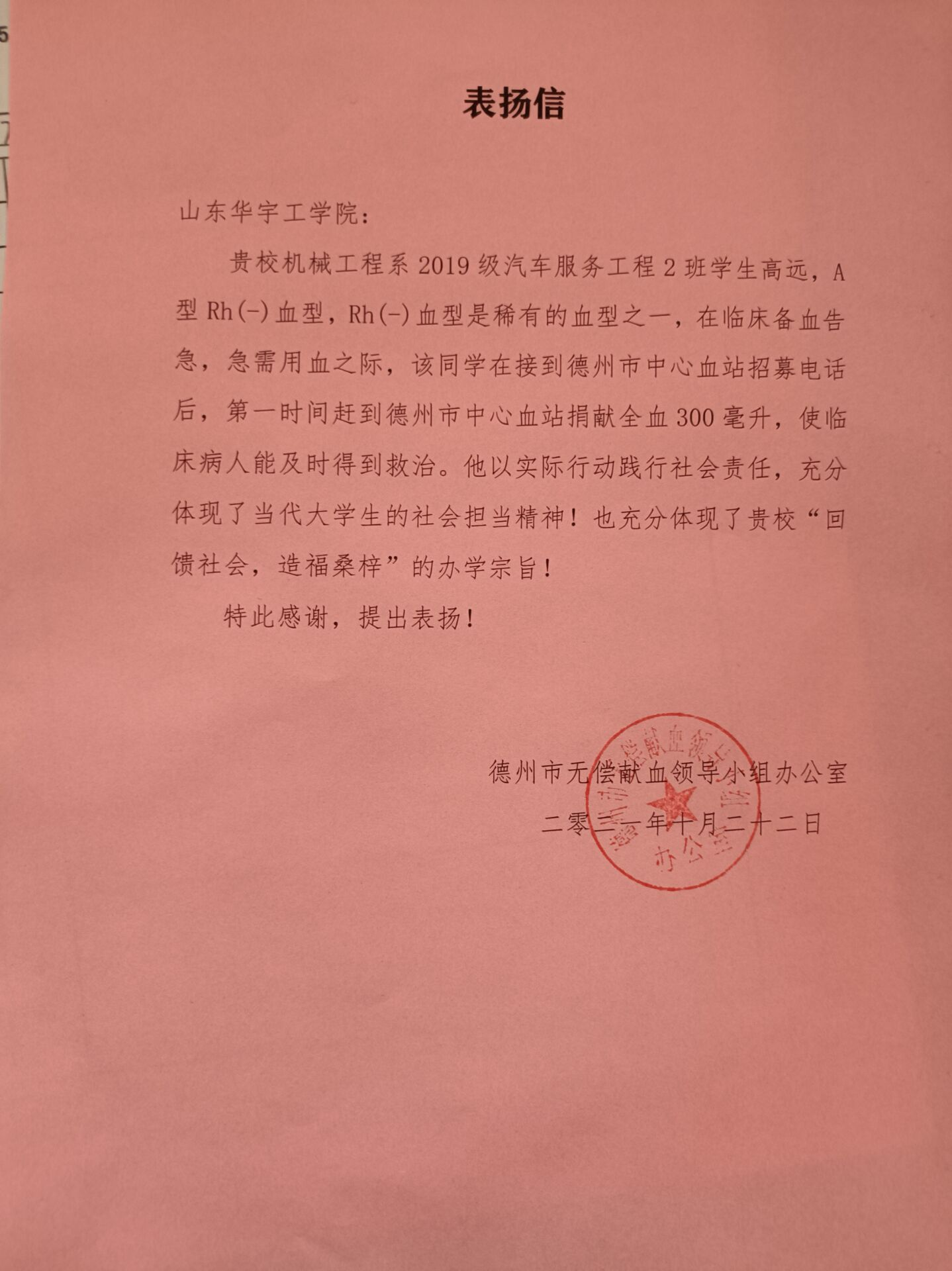 19本科汽服2班高远同学,为A型Rh(-)血型。(Rh-)血型是稀有的血型之一,在临床备血告急,急需用血之际,高远同学在接到德州市中心血站招募电话后,第一时间赶到德州市中心血站捐献全血300毫升,使临床病人能及时得到救治。该生以实际行动践行社会责任,充分体现了当代老员工的社会担当精神。