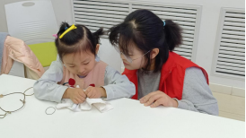 活动过程中,志愿者先为参与活动的小孩子们发放了布料等制作工具,随后讲解人员为小朋友们讲解了蓝染的历史及制作过程,在志愿者的帮助下,小朋友们按照折叠、捆绑、浸染三步来制作自己的作品。活动现场充满了欢声笑语,大家相互交流心得,分享技巧,整个氛围温馨和谐。