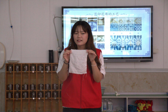 活动开始前,志愿者向参与活动的小朋友介绍了有关扎染的历史和种类,讲解了扎染的基本内容以及具体制作步骤和捆扎手法。随后小朋友们在志愿者们的指导帮助下,通过体验捆绑、夹结、缝绞、着色等手法,完成了扎染作品制作,并在实践中感受手工艺术古朴自然之美。